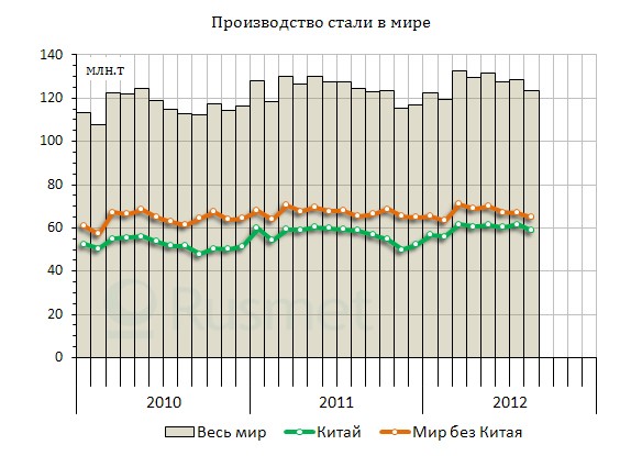 По данным World Steel Association (WSA), в августе 2012 года мировое производство стали сократилось на 3,9% по сравнению с предыдущим месяцем и примерно на 1% по сравнению с августом прошлого года, составив около 123,7 млн. т. Это самый низкий показатель за последние полгода. Металлургические компании, наконец, отреагировали на рыночный спад сужением объема предложения, хотя, возможно, предпринятого ими уменьшения производства еще недостаточно, чтобы сбалансировать рынок. Степень загрузки мощностей в мировой сталелитейной отрасли в августе снизилась до 75,5% ? минимального показателя с декабря прошлого года.