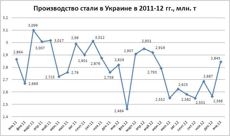 В январе 2013 г. украинские металлургические предприятия увеличили производство стали по сравнению с аналогичным периодом прошлого года на 0,9%, до 2,845 млн. т, чугуна – на 1%, до 2,497 млн. т.