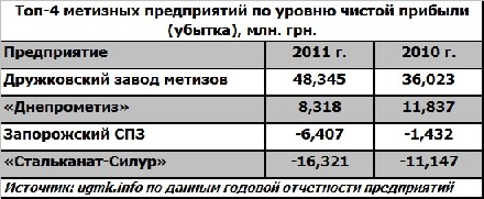 В метизной подотрасли в 2011 г. при общем росте выручки прибыльными у «Днепрометиза» прибыль сократилась на треть, а у Запорожского СПЗ и «Стальканат-Силур» убытки существенно выросли. В то же время, Дружковский завод металлоизделий сумел нарастить прибыль на треть.