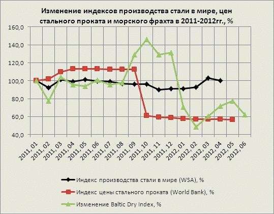 О «замерзании» мирового рынка сталепродукции свидетельствует и корректировка World Steel Association (WSA) своих прогнозов. Если в конце 2011 г. WSA прогнозировала на 2012 г. увеличение мирового стального спроса на 5,4%, то в мае 2012 г. этот показатель был снижен до 3,6%.