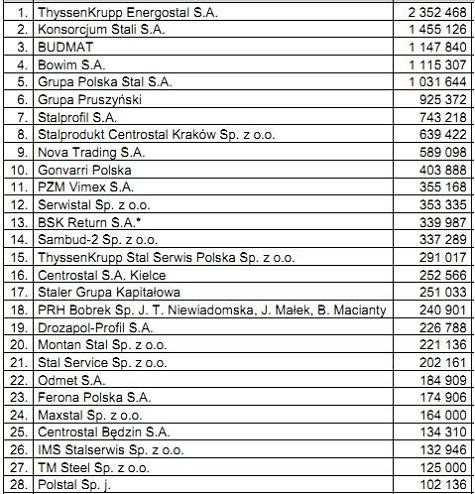 Что касается продаж металлопродукции, то в 2011 г. рейтинг крупнейших польских дистрибьюторов стали, в ходящих в Polska Unia Dystrybutorow Stali, возглавила компания ThyssenKrupp Energostal, которая в минувшем году реализовала 2,3 млн. т металлопродукции.