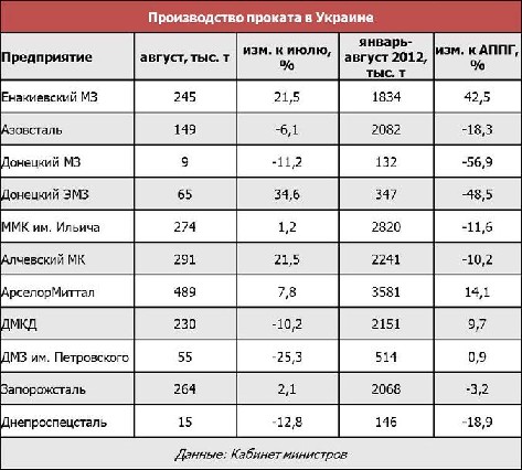 Согласно данным Кабинета министров, в январе-августе выпуск проката в Украине составил 18,357 млн. т, что на 4,5% меньше АППГ. В то же время, по итогам августа украинские металлурги произвели 2,144 млн. т готового проката, что на 4,4% превышает показатель июля и на 15,2% меньше августа 2011 г. Наибольшее увеличение объемов производства по итогам ушедшего месяца наблюдалось на Донецком ЭМЗ (34,6%), Алчевском МК (21,5%) и Енакиевском МЗ (21,5%). В то же время, наибольший спад производства в месячном исчислении наблюдался на ДМЗ им. Петровского (-25,3%), Днепроспецсталь (-12,8%) и Донецкий МЗ (11,2%). По данным "Металлургпрома" в сентябре отечественные металлурги планируют нарастить объемы производства проката на 3,3% до 2,37 млн. т.