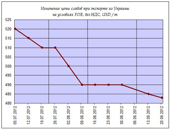 На рынке слябов и плоского проката, в отличие от длинномеров, даже не было намека на осеннее оживление: цены безостановочно снижаются, начиная с апреля 2012 года. По данным УПЭ, стоимость слябов в начале августа почти на месяц стабилизировалась на уровне 490 долл./тонн, но уже в сентябре удешевление продолжилось, и ко второй декаде сентября цена достигла 483 долл./тонн. Цифры "Метал-Курьера" показывают еще более глубокое падение – до 475 долл./тонн – таких низких цен не было с весны 2010 года.