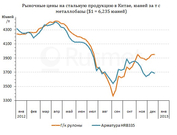 Национальная строительная отрасль во второй половине декабря переживает некоторый спад, вызванный похолоданием в северо-восточных провинциях. Из-за этого рост цен на арматуру намного отстает от соответствующих показателей плоского проката. Тем не менее, в 2013 году в стране должны стартовать новые крупные проекты в области инфраструктурного строительства. Только на расширение железнодорожной сети правительство направило в январе-ноябре 2012 года более $69 млрд., на 9% больше, чем год назад, а на следующий год капвложения будут, как минимум, не меньшими.