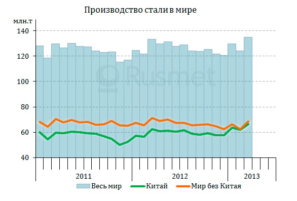 Как сообщает World Steel Association (WSA), в марте 2013 года в 63 странах мира, подающих свои статистические данные в эту международную организацию, было выплавлено 134,9 млн. т стали, что представляет собой рекордный показатель за всю историю глобальной металлургической отрасли. Хотя средний уровень загрузки мощностей в мировой сталелитейной промышленности уменьшился до 79,4% по сравнению с февральскими 80,5%, а среднедневной объем производства сократился от 4,40 млн. до 4,35 млн. т в день, общий уровень выпуска в марте превысил показатели того же месяца 2012 года на 1,0%.