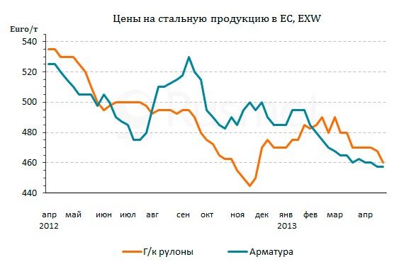 Для европейских металлургов проблема обостряется еще и вследствие превышения предложения над спросом. По итогам первого квартала 2013 года выплавка стали в ЕС сократилась на 5,4% по сравнению с показателями аналогичного периода годичной давности, при этом, в 10 странах спад превысил 10%. Вследствие относительно низкого курса евро по отношению к доллару объемы импорта в последнее время сравнительно невелики. Тем не менее, участники рынка говорят об избыточном объеме предлагаемой к продаже стальной продукции, особенно, длинномерной. Производителям не помогла даже некоторая активизация строительных работ с начала апреля. К концу месяца котировки на арматуру не превышают 435-455 евро за т EXW в Италии и 480-500 евро за т CPT в Германии и Польше, где очень велика конкуренция между поставщиками из разных стран.
