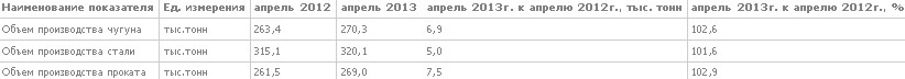 В апреле 2013 года произведено 270,3 тыс.т чугуна, 320,1 тыс.т стали, 269 тыс.т проката.