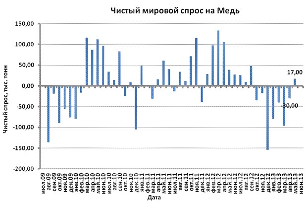 21 августа в 15:30 по GMT Международная исследовательская группа по меди опубликовала данные по спросу-предложению меди на мировом рынке за май. Производство меди в мае увеличилось на 2,69% до 1791 тыс. тонн, потребление меди - на 5,48% до 1808 тыс. тонн. В итоге, дефицит меди в мае в мире составил 17 тыс. тонн. Дефицит зафиксирован впервые за последние 8 отчетных месяцев, что будет положительно влиять на котировки данного металла. Основное увеличение спроса было зафиксировано в Китае (максимум с декабря 2011 года) и США (максимум с марта 2012 года).